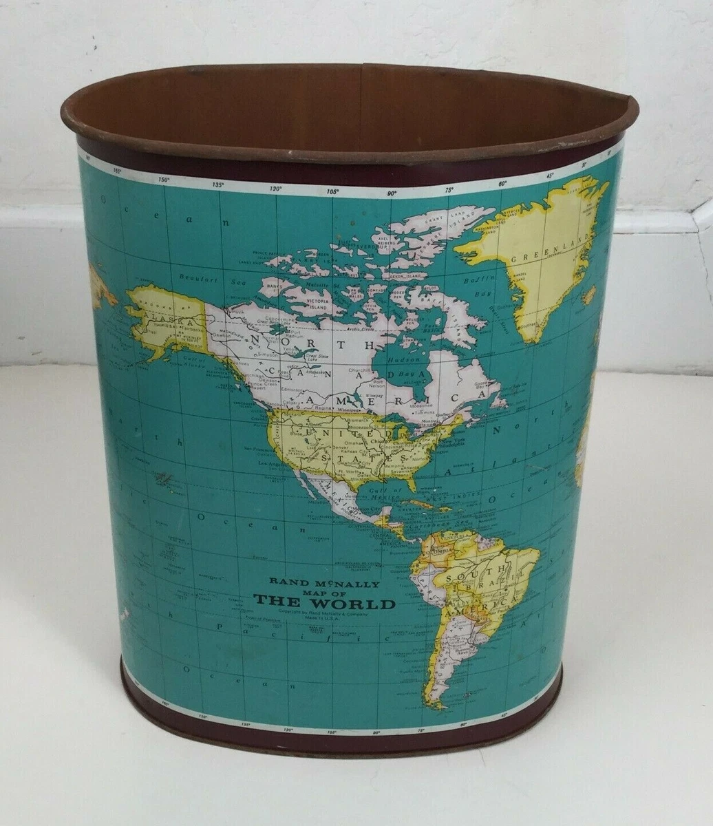 Weibro Vintage World Map Trash Can Mid Century Metal Waste Basket